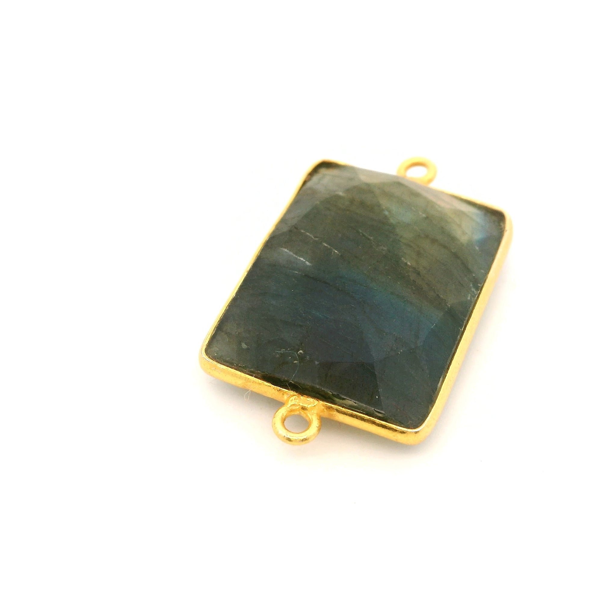 Multi Fire Labradorite Rectangle Connector – 15x20mm, 2 Loops, Bezel Set in 925 Sterling Silver & Gold Plated Silver, 1 Pc