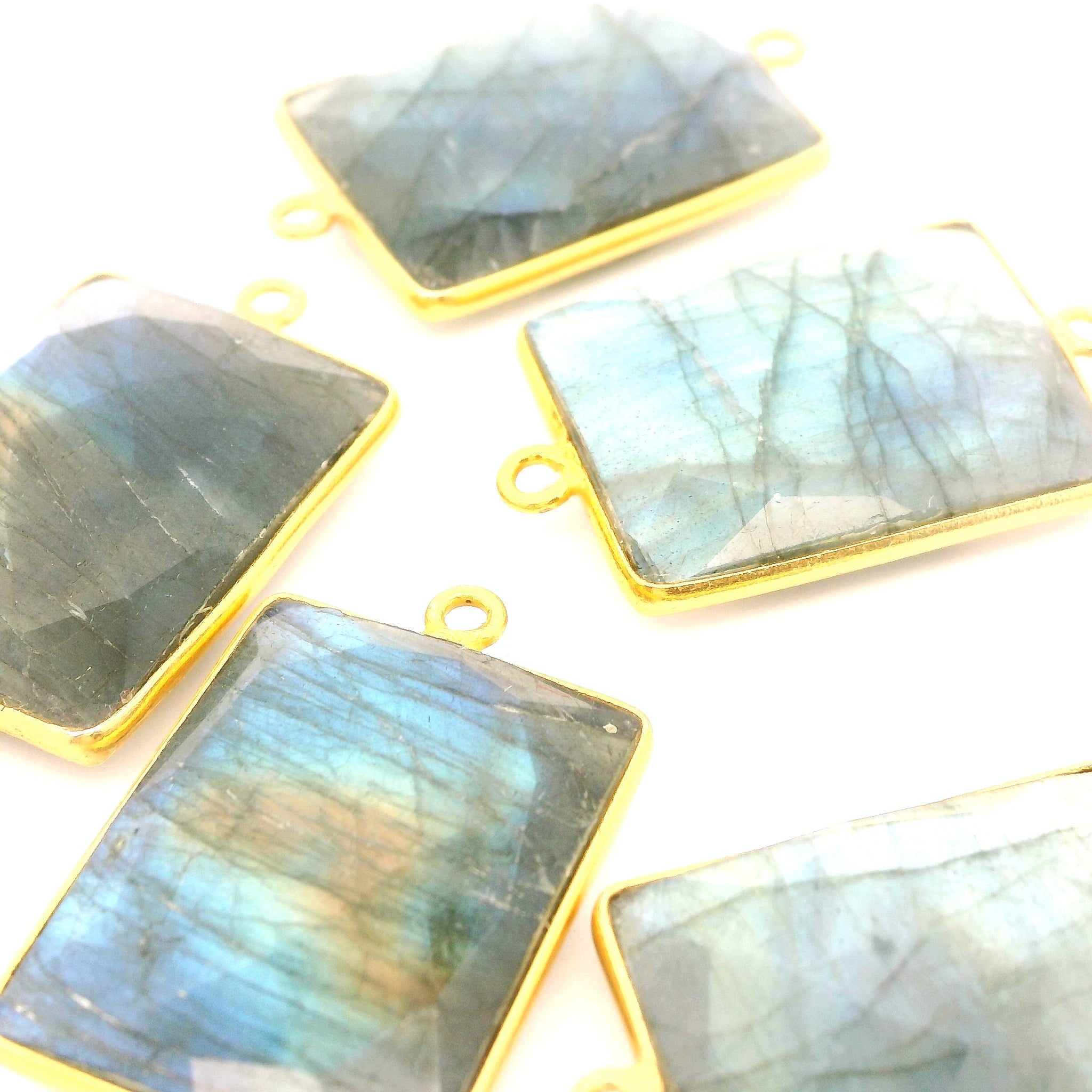Create stunning jewelry with our Multi Fire Labradorite Rectangle Connector, available in 15x20mm size. The rectangular shape enhances the natural flashes of blue and green labradorite, beautifully bezel set for strength and style.