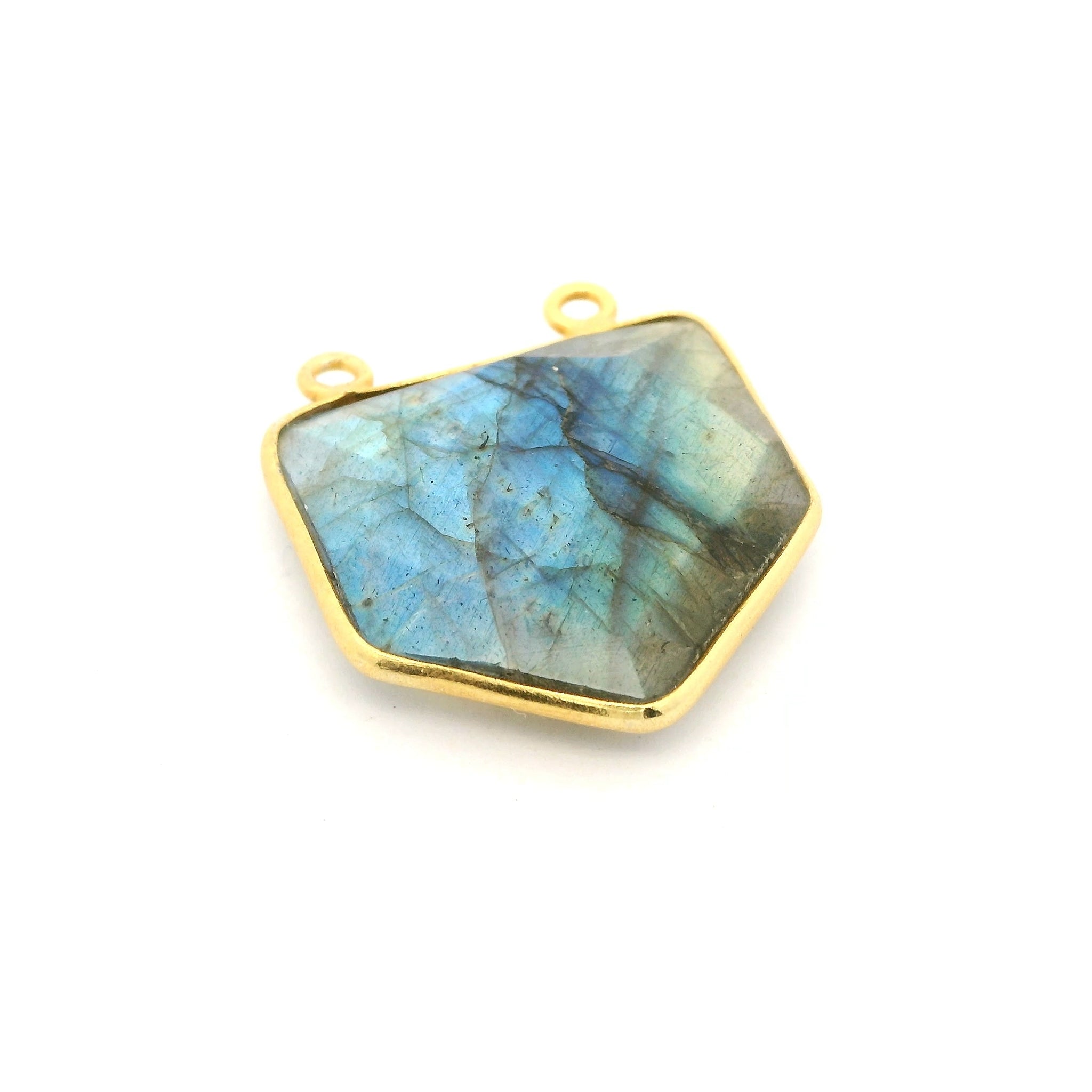 Elevate your jewelry creations with our Multi Fire Labradorite Pentagon Connector, sized 18x18mm. The unique pentagon cut enhances the natural fire of labradorite, showcasing blue, green, and golden flashes. Securely bezel set, it’s both durable and stylish.