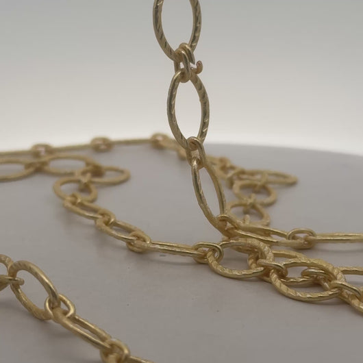 This solid copper chain features a patterned marquise shape with a gold finish and silver plated coating.