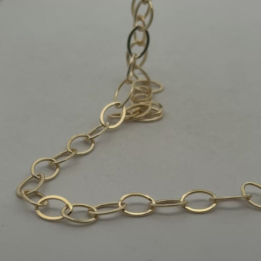 This gold plated brass chain features a flat oval cable design with a smooth and flat finish. This electro plated and E-coated chain is made of brass.