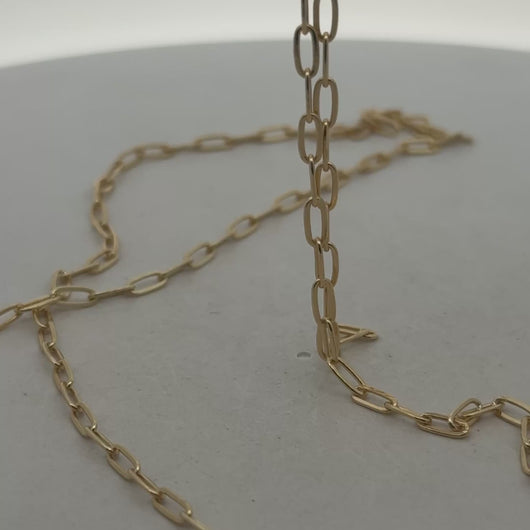 This gold plated brass chain features a flat long cable design with an electro plated finish.