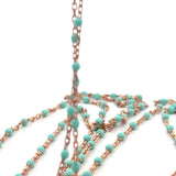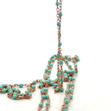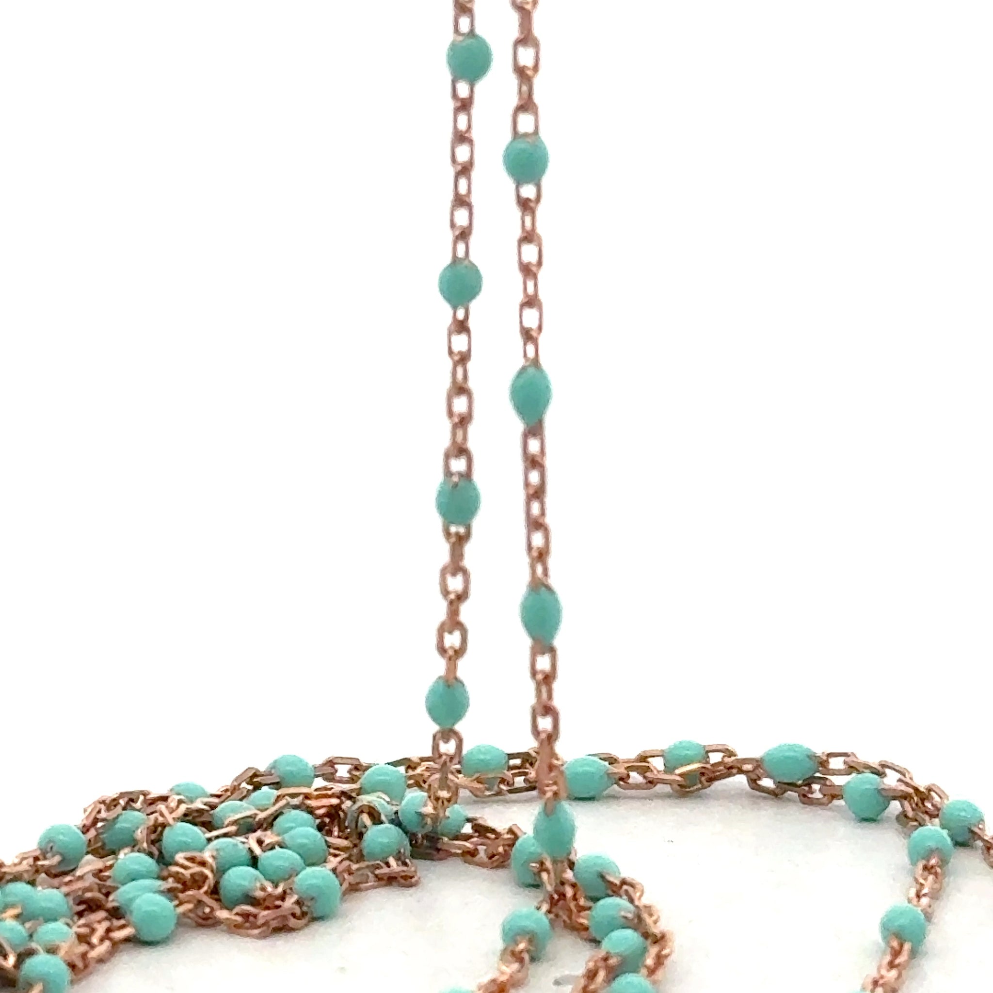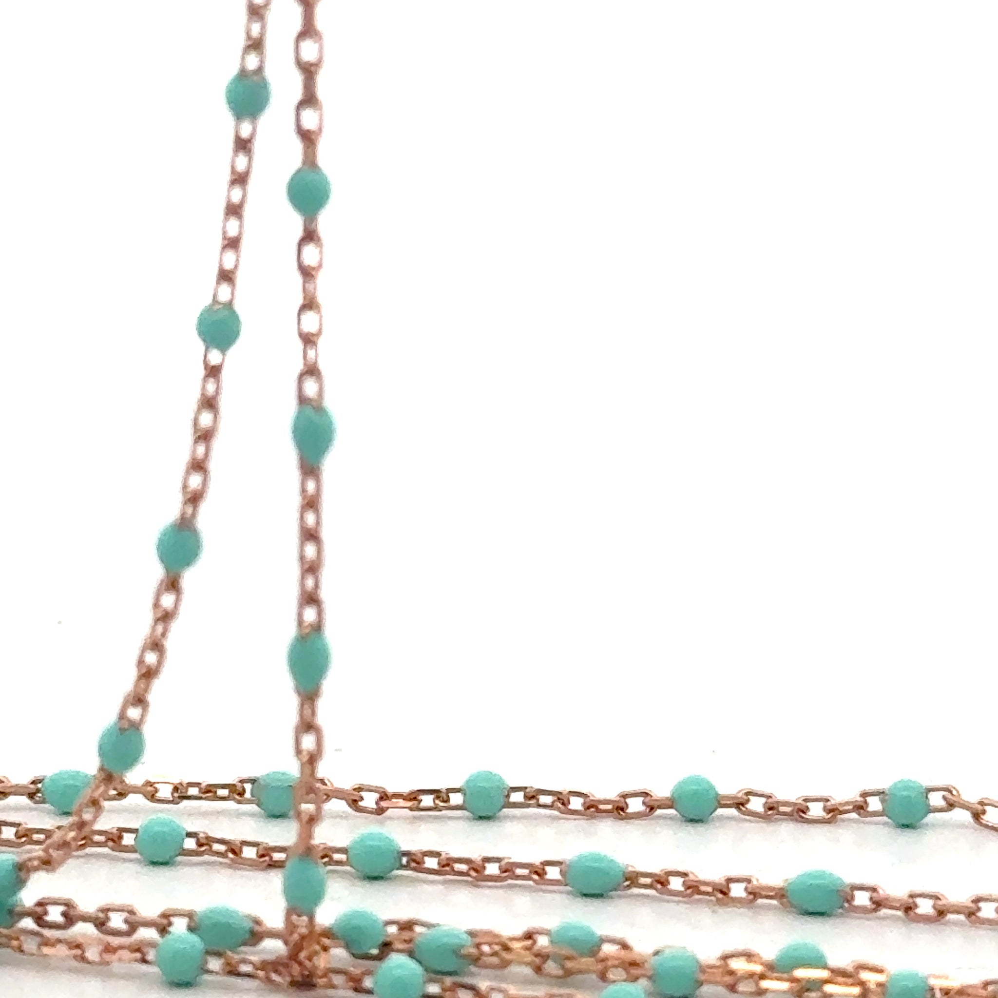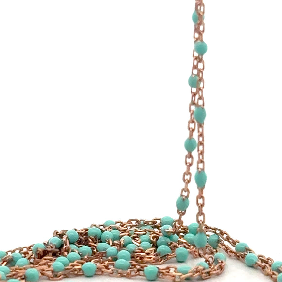 This 1-foot sterling silver DC cable chain is beautifully rose gold plated for a warm, elegant finish. It features striking turquoise enamel beads, each measuring approximately 1.43 x 2.15 mm, spaced evenly with 0.6 mm gaps between beads. Perfect for adding a touch of color and sophistication to your jewelry creations or worn alone as a delicate chain.