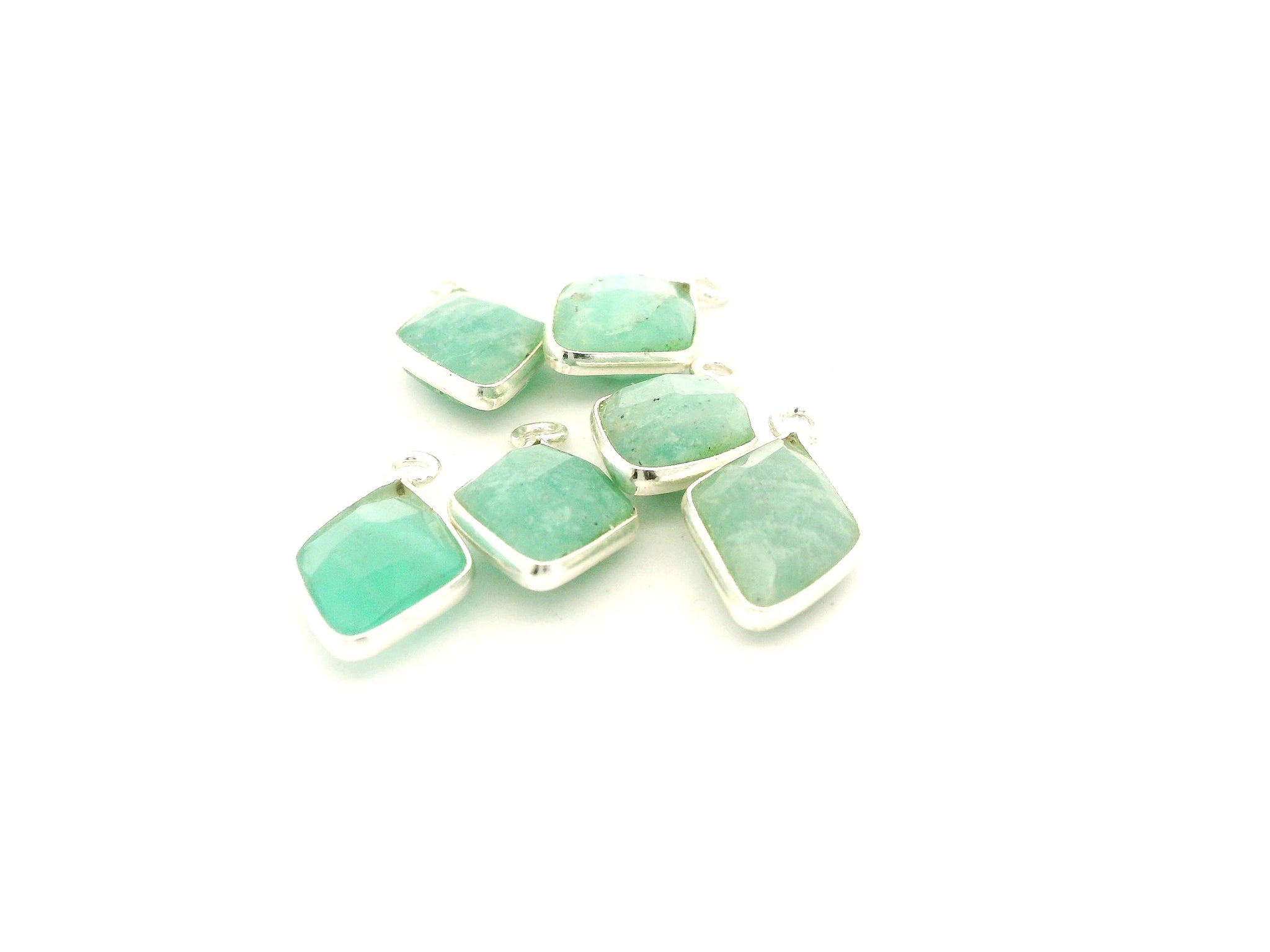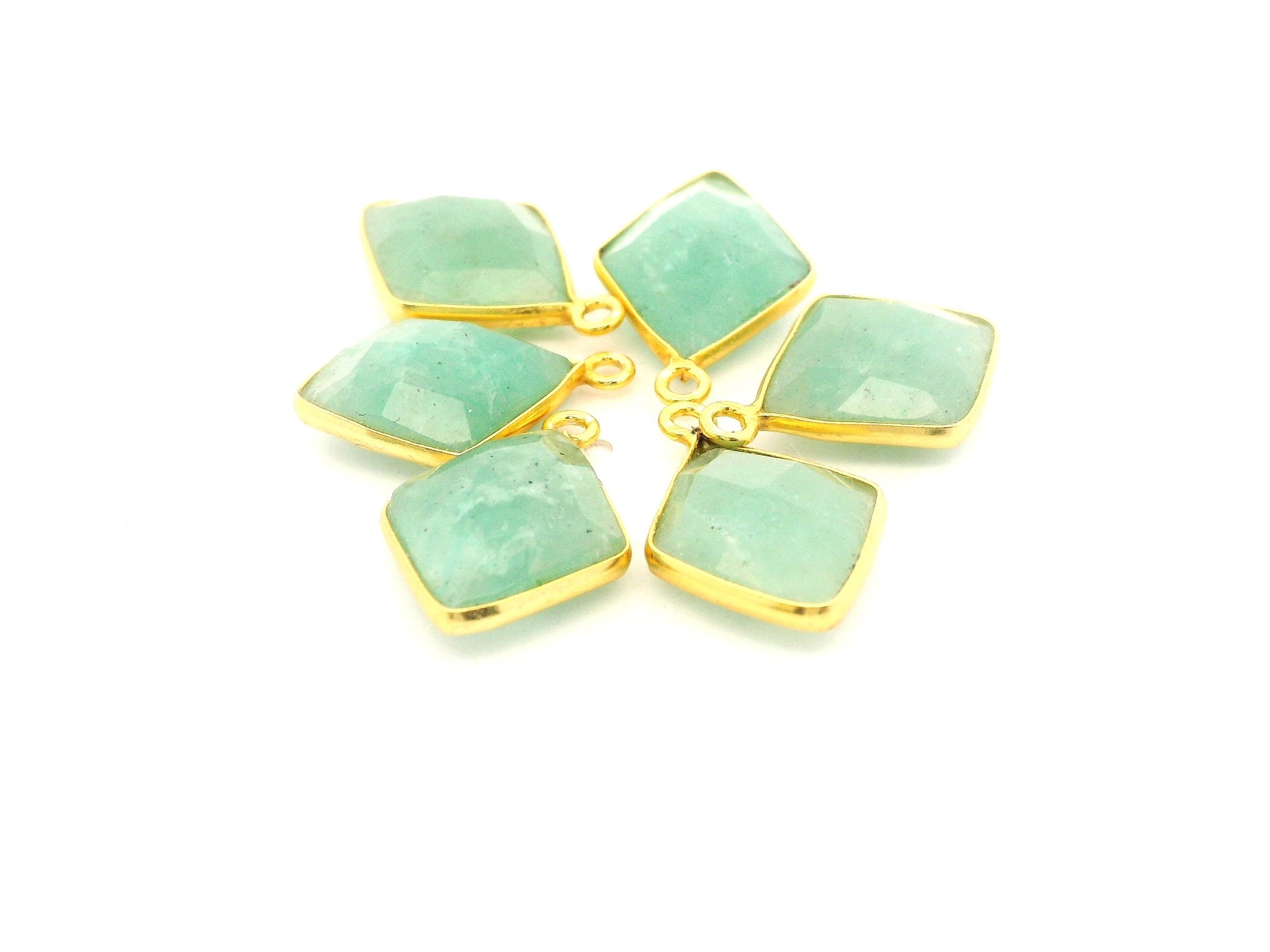 Amazonite diamond-shape pendants in a soothing teal tone, set in gold plated over sterling silver / 925 silver. Each stone (8x12mm or 12x15mm) is bezel set with one loop, perfect for necklaces, earrings, or focal charms in jewelry designs.