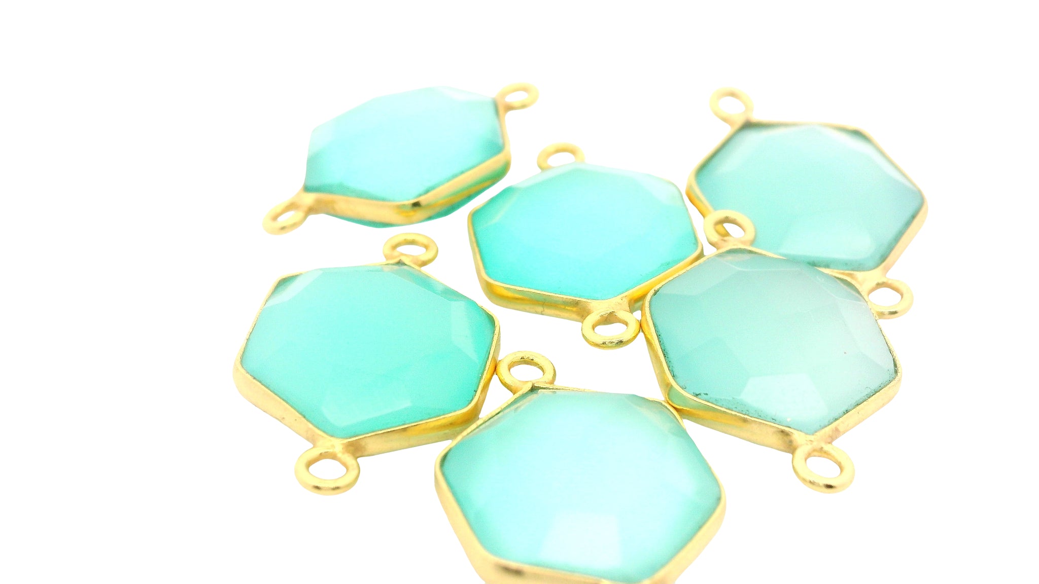 Add a touch of soft aqua color to your jewelry designs with this beautiful Aqua Chalcedony Hexagon Connector (12mm). Featuring two secure loops and gold plated over .925 sterling silver, this gemstone link is perfect for creating necklaces, bracelets, earrings, or dainty charms.