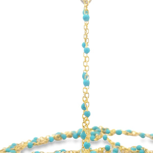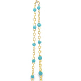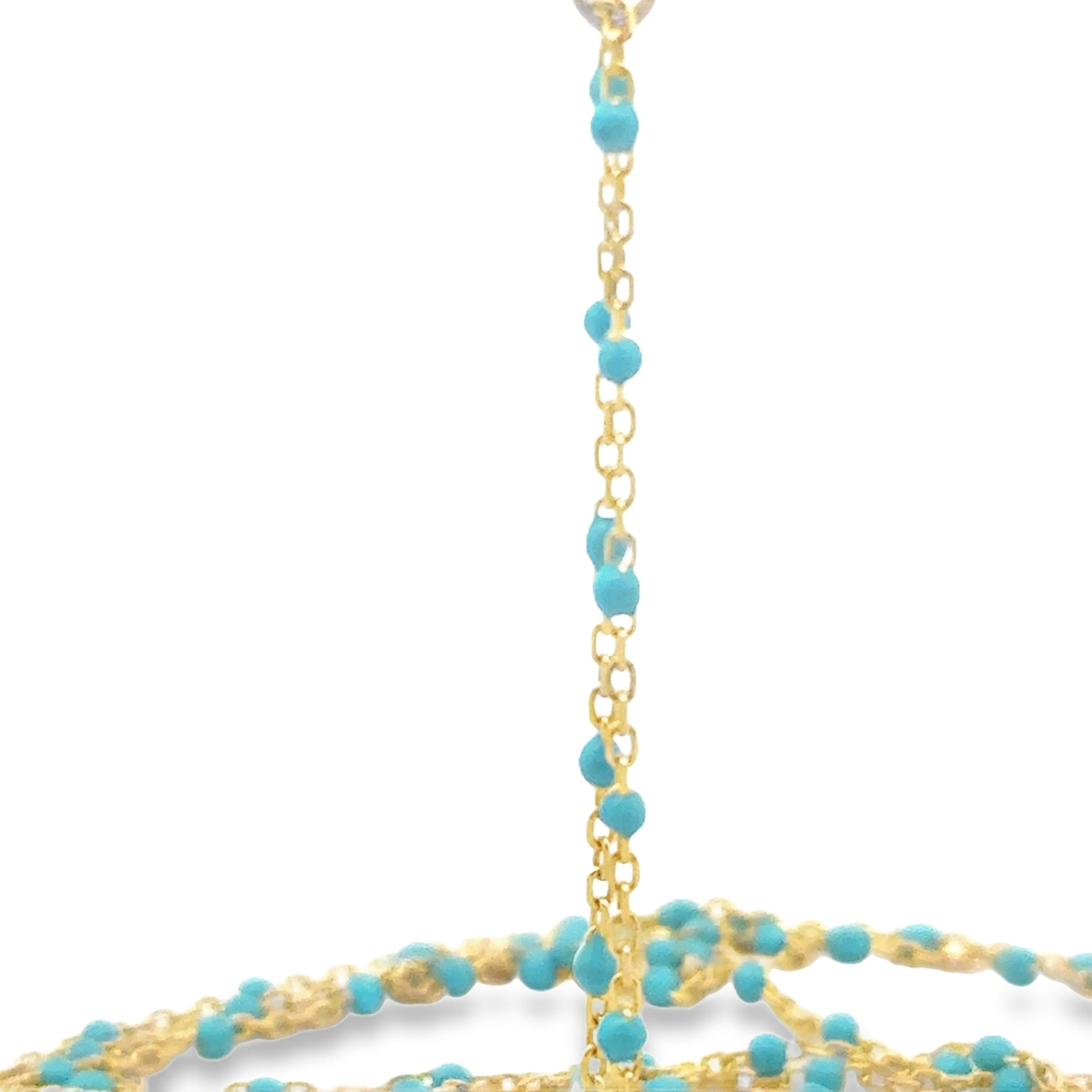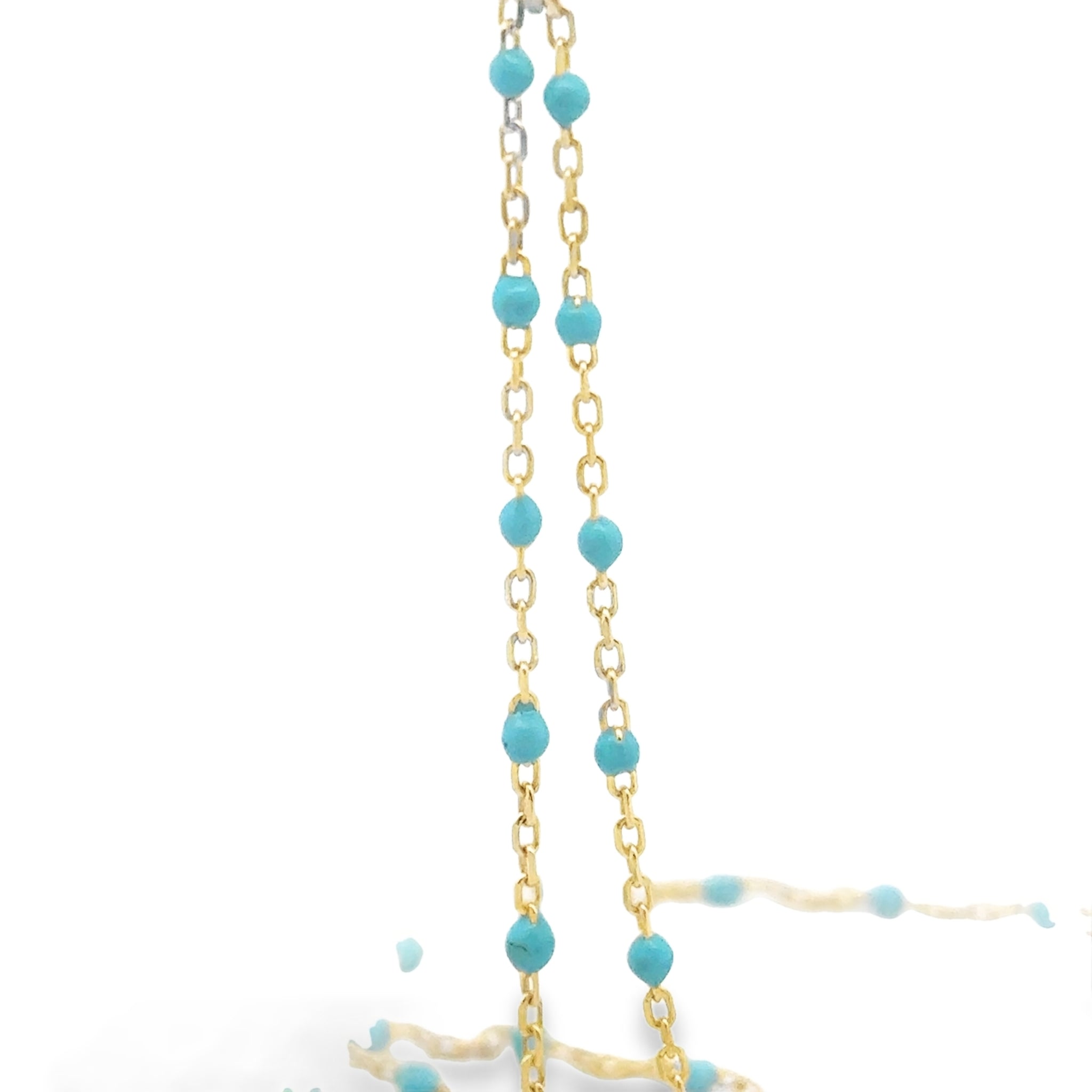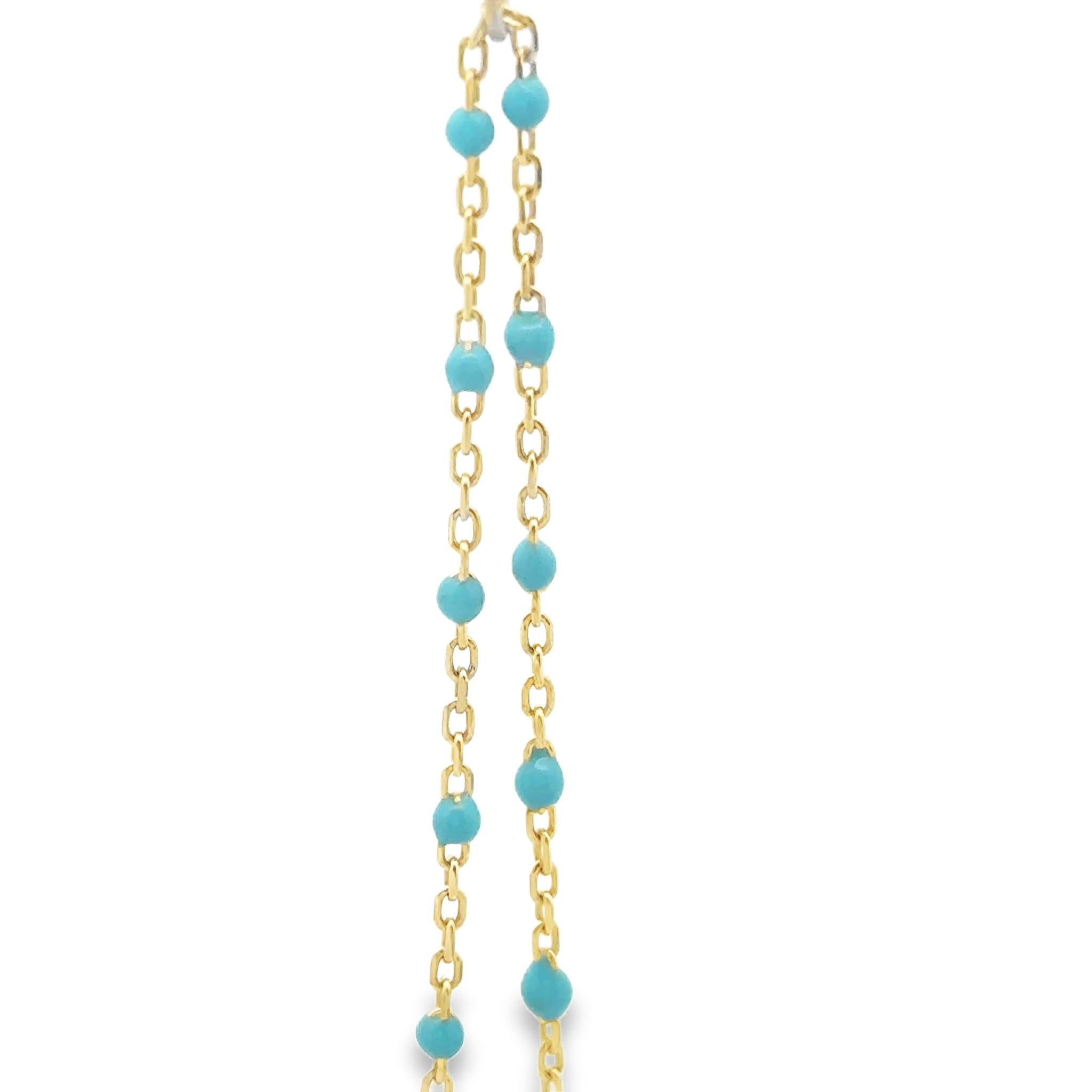 This 1-foot 925 sterling silver DC cable chain features a beautiful flash gold plating for a warm, radiant finish. Decorated with vibrant turquoise enamel beads, each bead measures approximately 1.43 x 1.5 mm, spaced evenly with 0.6 mm gaps between them. Perfect for jewelry making or worn alone as a delicate and colorful chain.