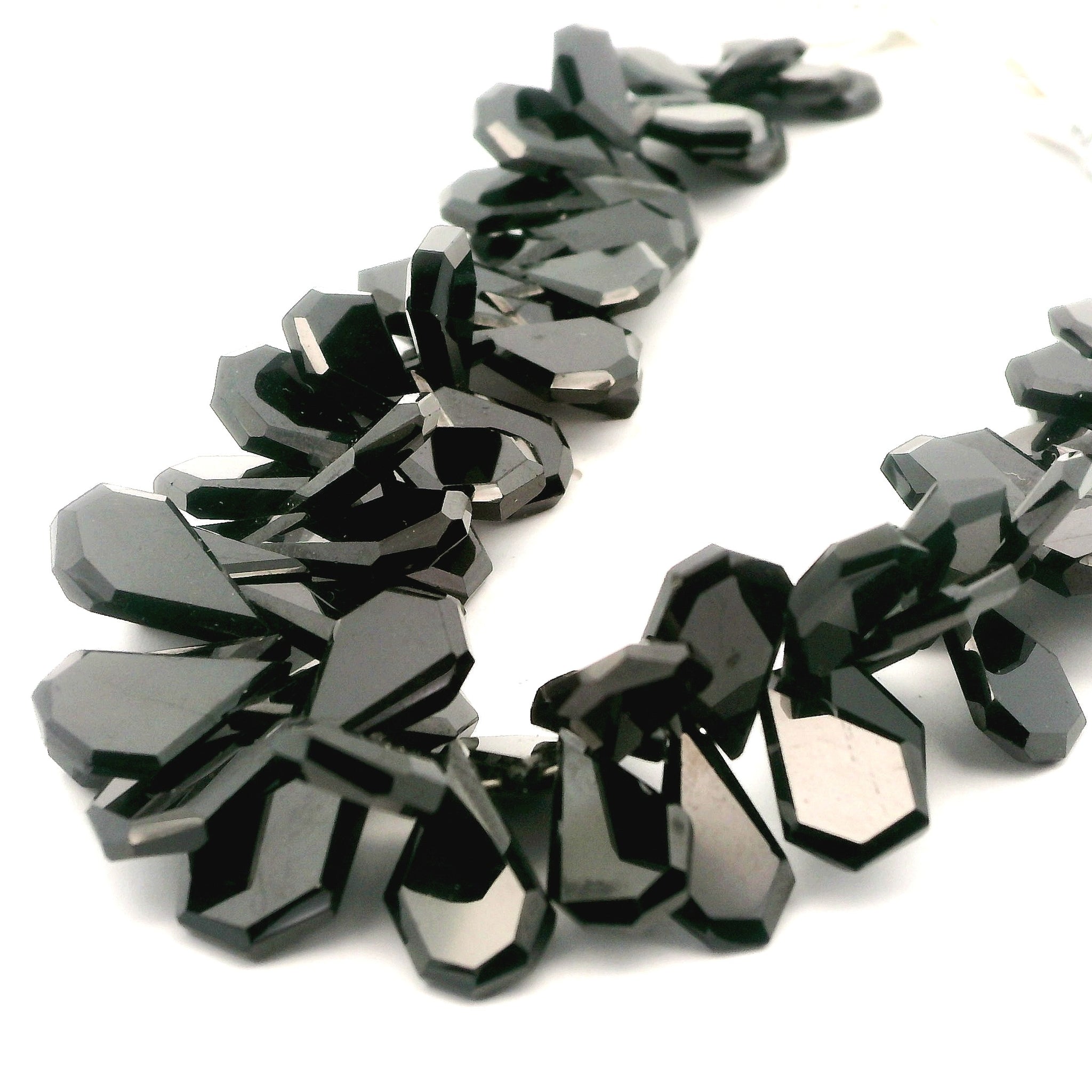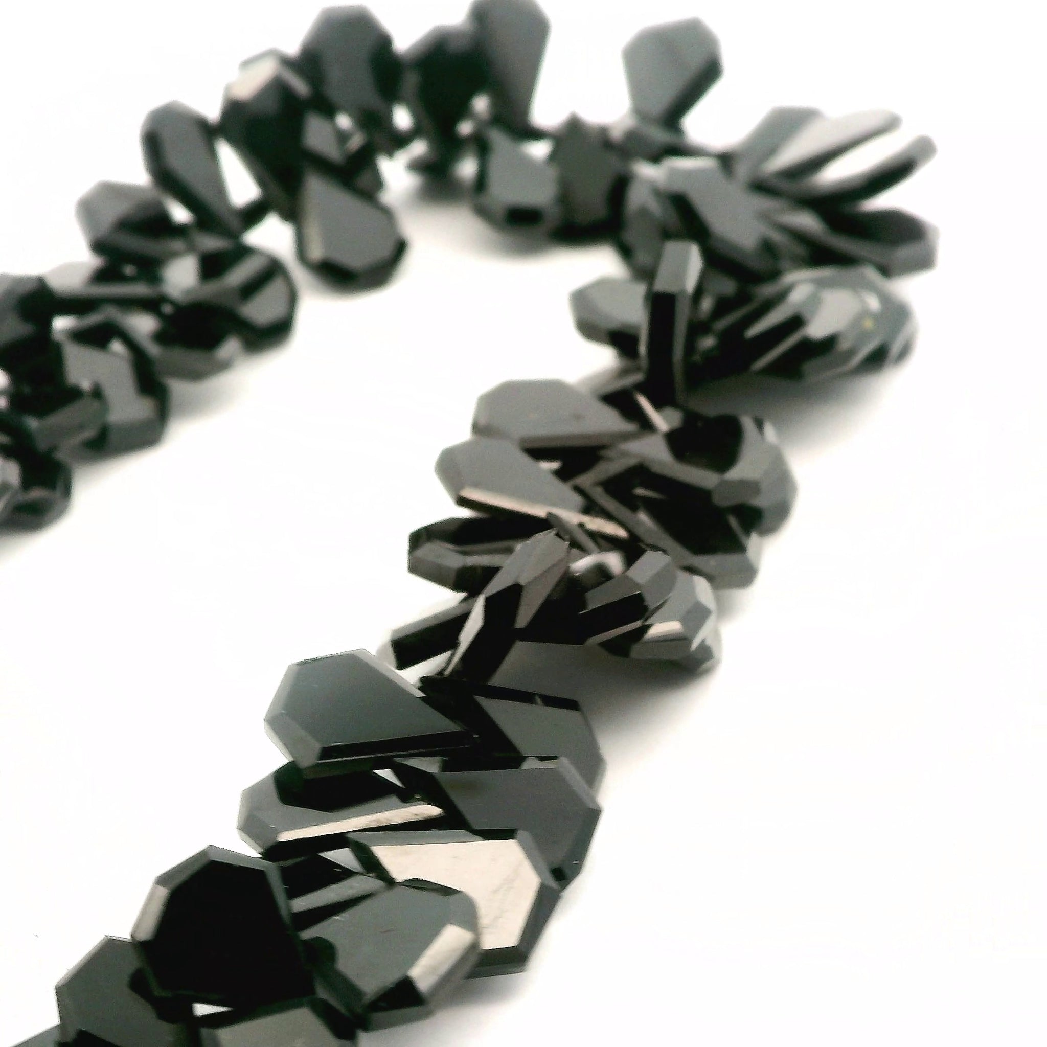 These natural black onyx faceted pentagon nugget beads feature a deep, glossy black tone with sharp, angular faceting that creates a bold, modern look. The geometric pentagon-inspired shape adds strong visual interest and dimension, making these beads ideal for statement necklaces, edgy focal designs, and contemporary jewelry pieces. Beads are center-drilled and shown temporarily strung for protection and display. Natural variations in size and faceting are expected and enhance the distinctive character of genuine black onyx.