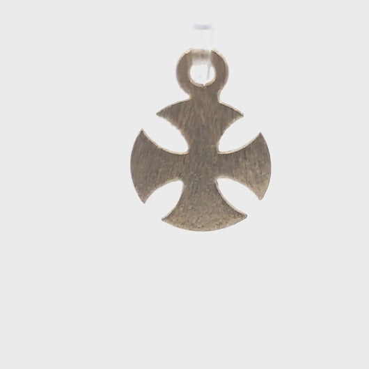 This gold finished curved iron cross pendent features a brushed finish and e-coating on a copper or brass base.