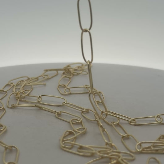 This elongated oval link modern chain is available in gold finish, silver plated, and copper options.