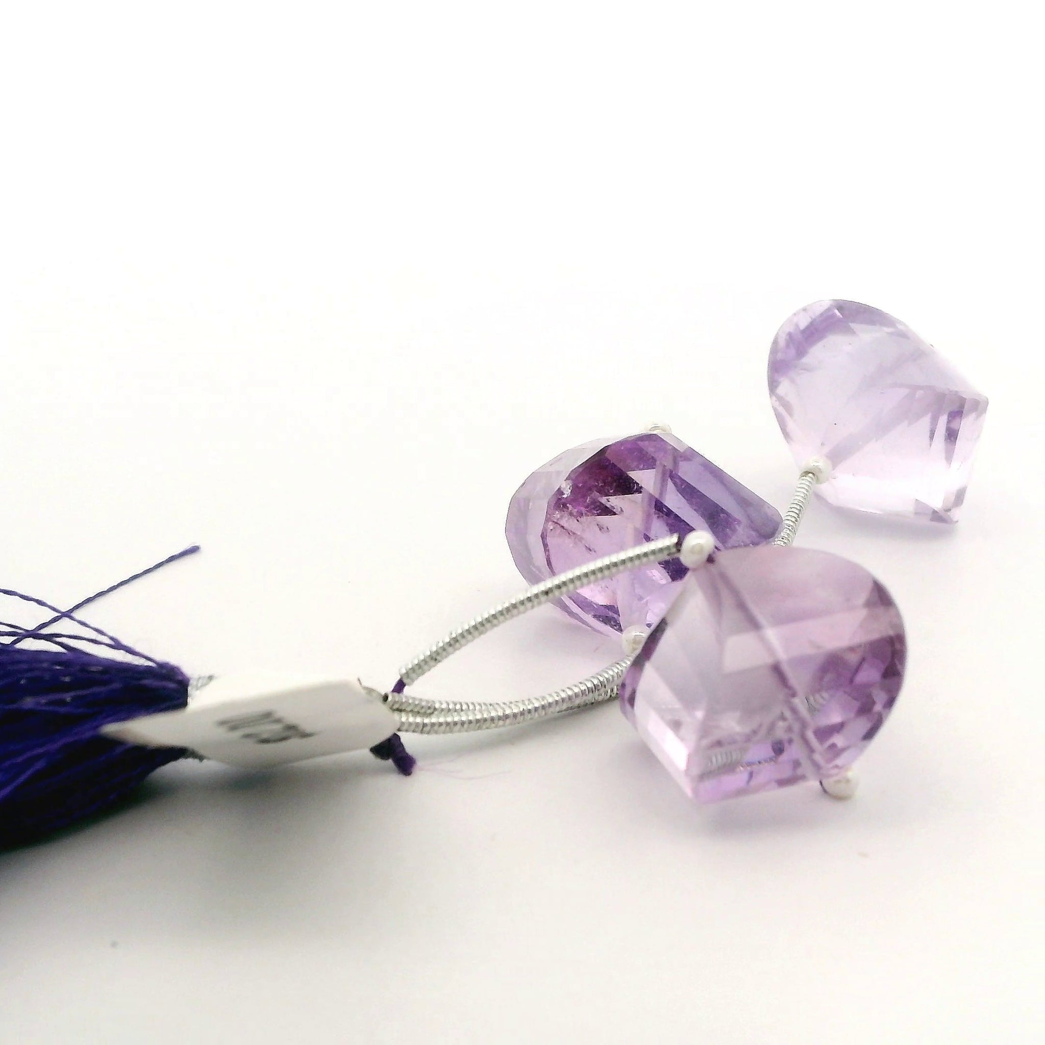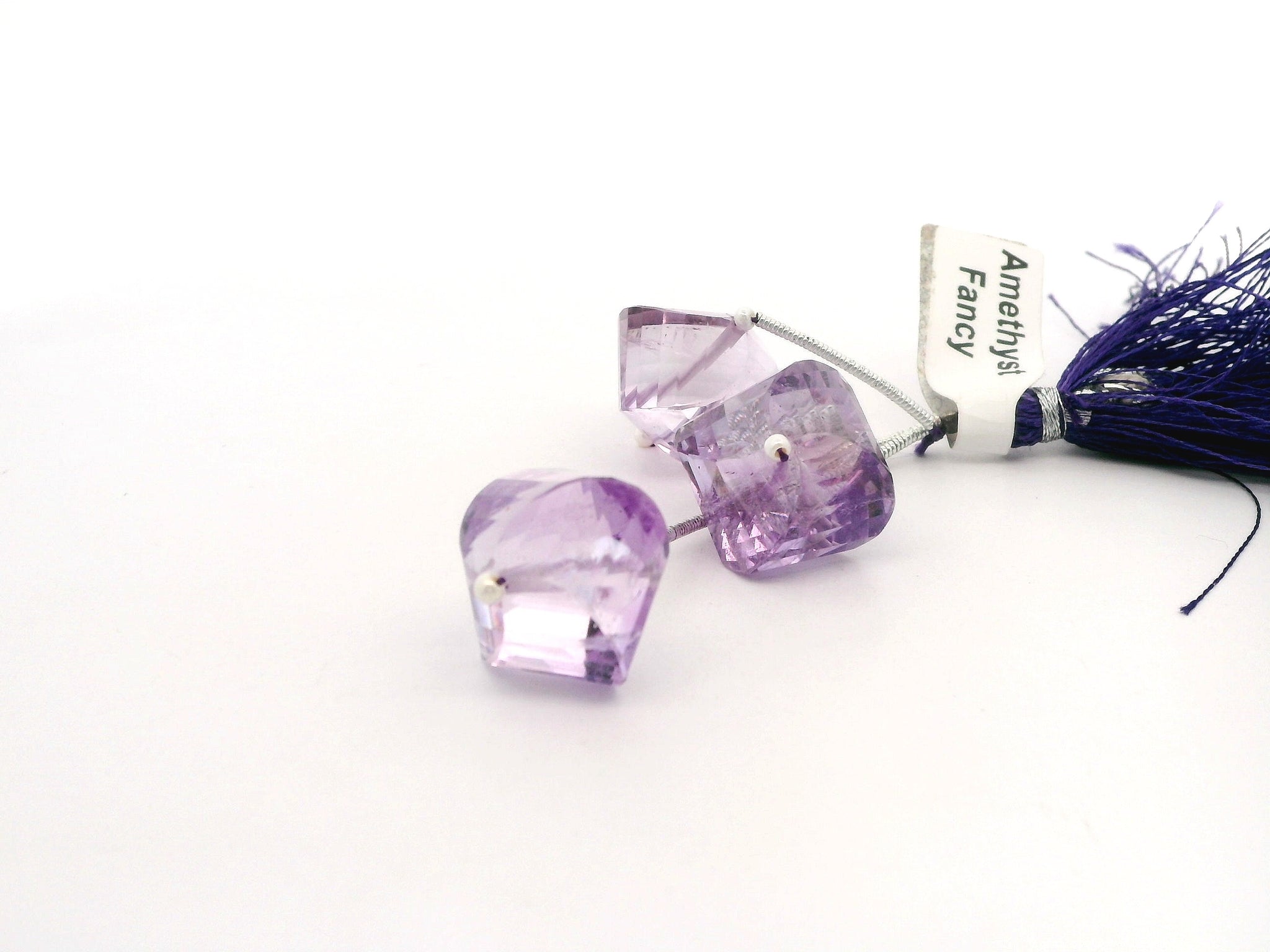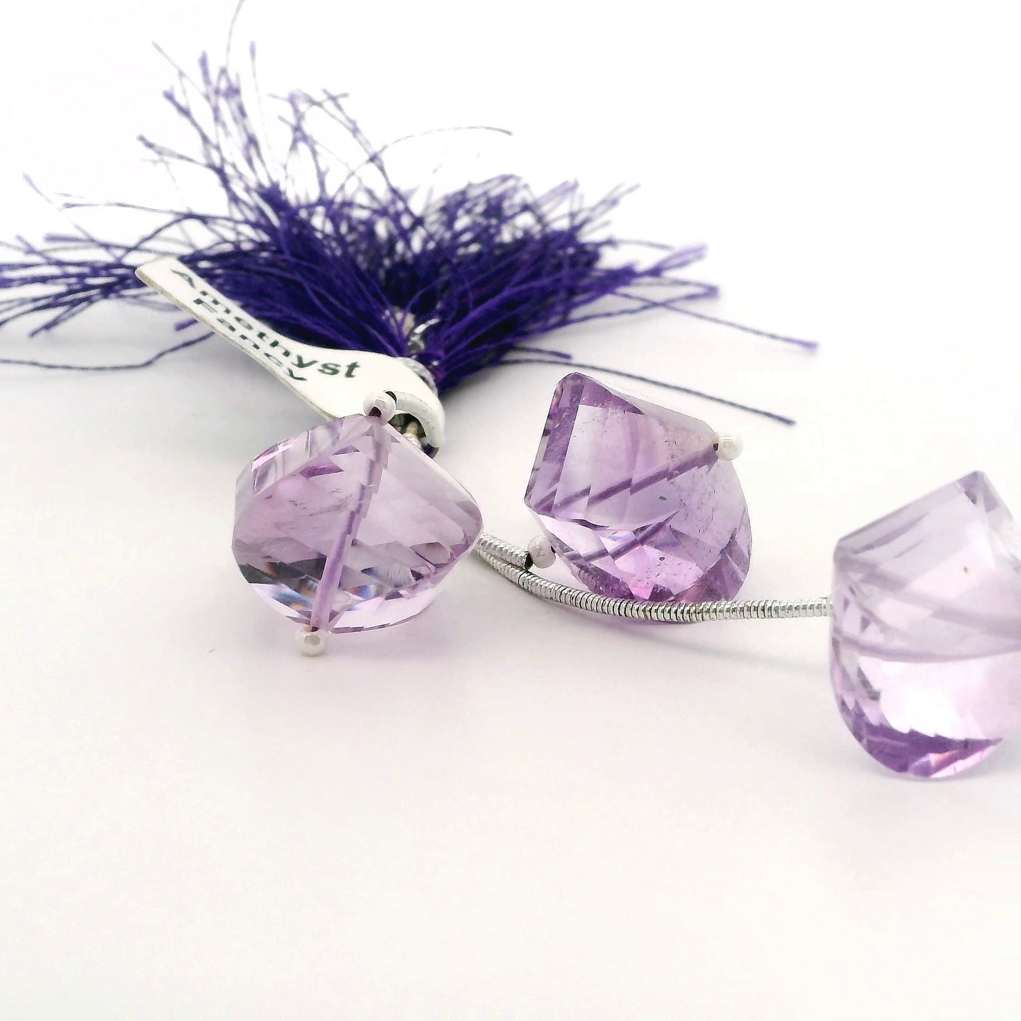 These 3 natural amethyst gemstone beads feature a faceted cube shape with soft lavender to light purple tones and natural internal inclusions. The crisp faceting adds gentle sparkle and a refined look, making them perfect for accent pieces, minimalist jewelry designs, or sample creations. Each bead is naturally unique, giving your designs an authentic gemstone character.