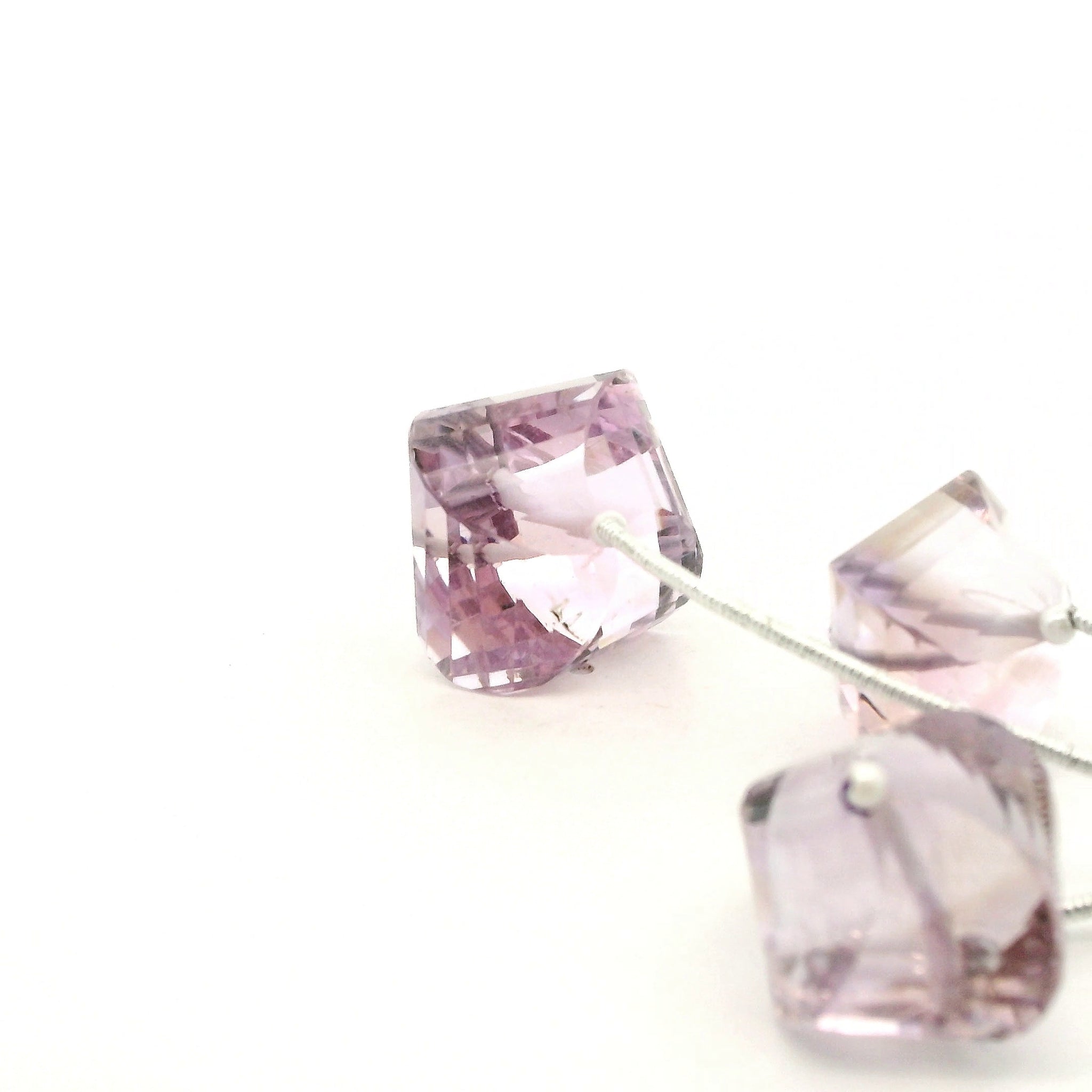 These 3 natural amethyst gemstone beads are cut in a faceted cushion shape, featuring soft lavender to light purple tones with natural internal inclusions and beautiful clarity. The precise faceting adds elegant sparkle and depth, making these beads ideal for earrings, pendants, bracelets, or refined accent pieces in custom jewelry designs. Each bead is naturally unique, highlighting the genuine beauty and character of real amethyst.