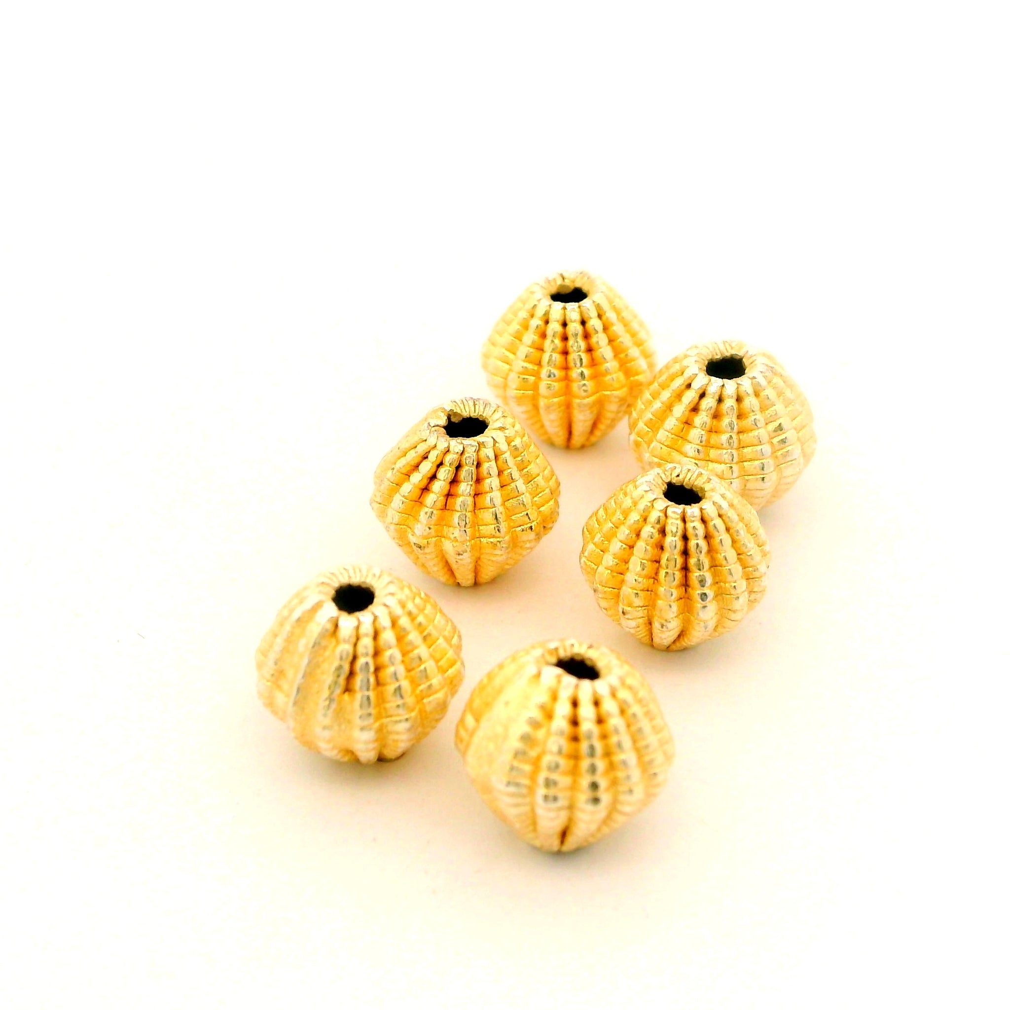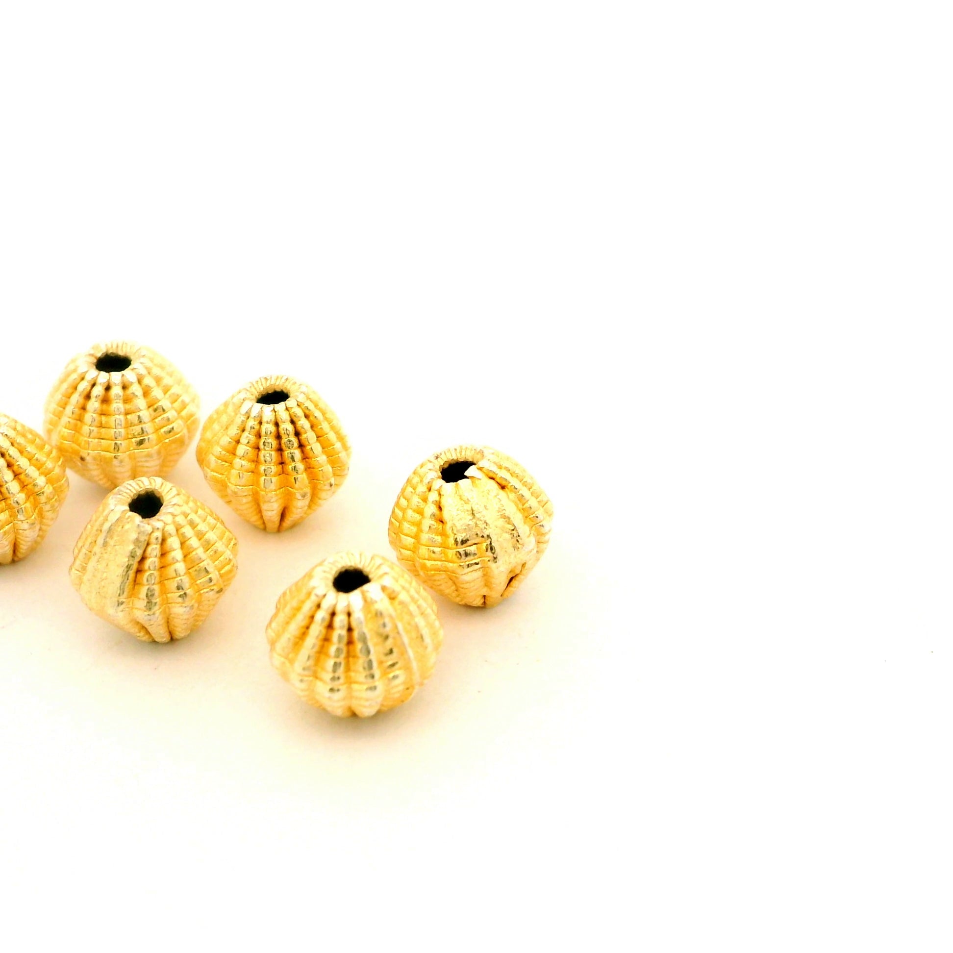 Enhance your jewelry projects with these Gold Finish Textured Ribbed Round Beads crafted from durable copper. Each bead measures 8mm x 8mm, making them the perfect size for bracelets, necklaces, earrings, and other designs.