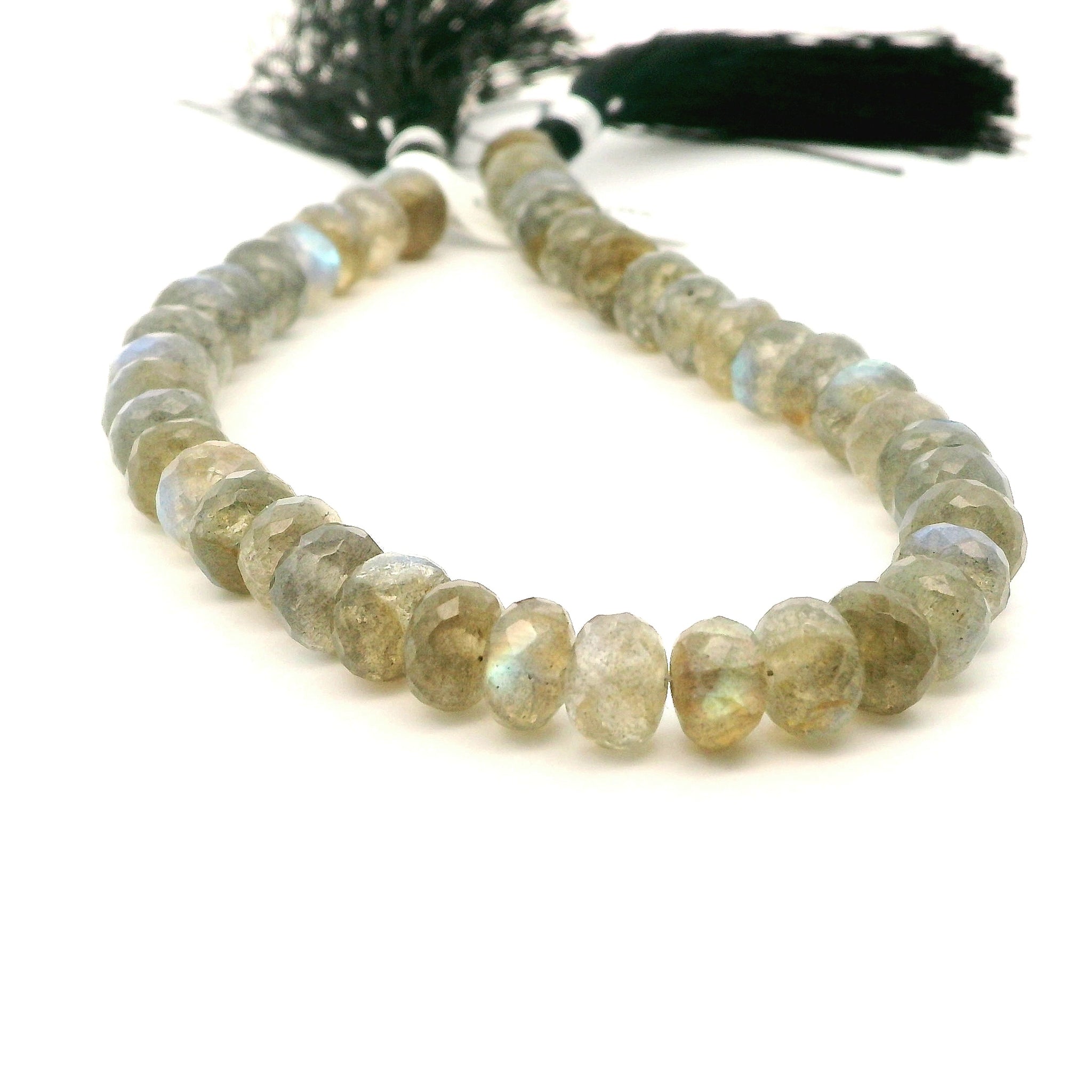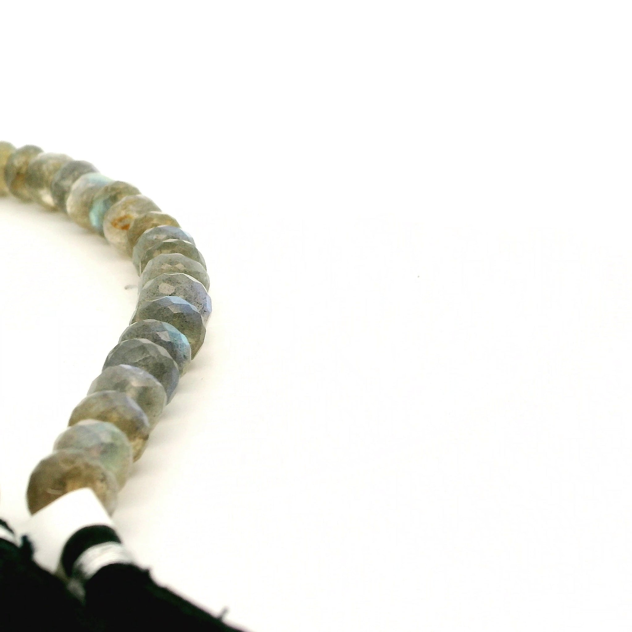 This strand features natural labradorite faceted rondelle beads with soft gray tones and flashes of blue and green that appear as the beads catch the light. Each bead is carefully faceted to enhance its natural shimmer, making this strand ideal for refined and modern jewelry designs. Beads measure approximately 4mm x 6mm and are strung as a single strand containing about 30 beads. Due to the natural nature of labradorite, color and flash may vary from bead to bead. Perfect for bracelets, necklaces, earrings, and other custom jewelry projects.