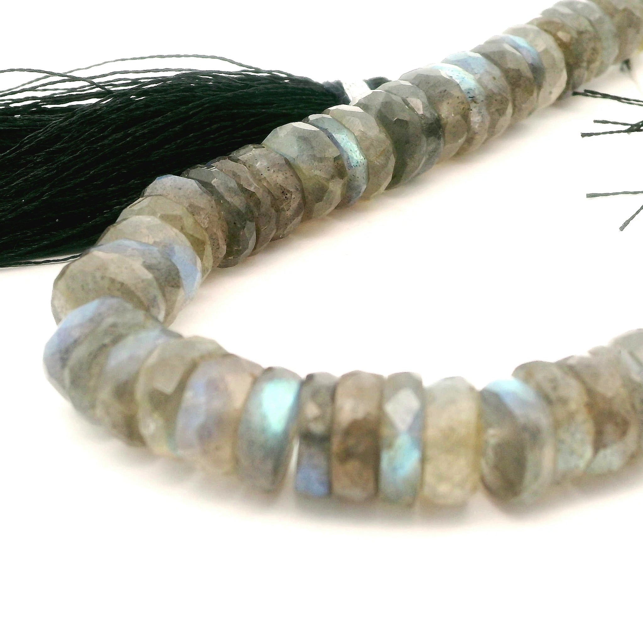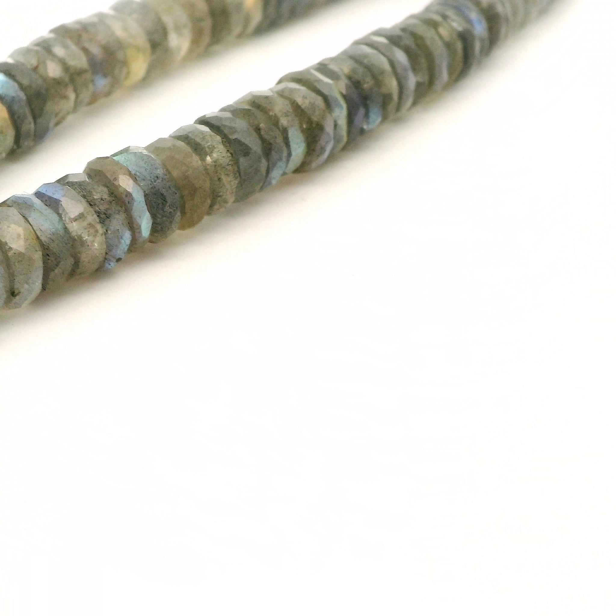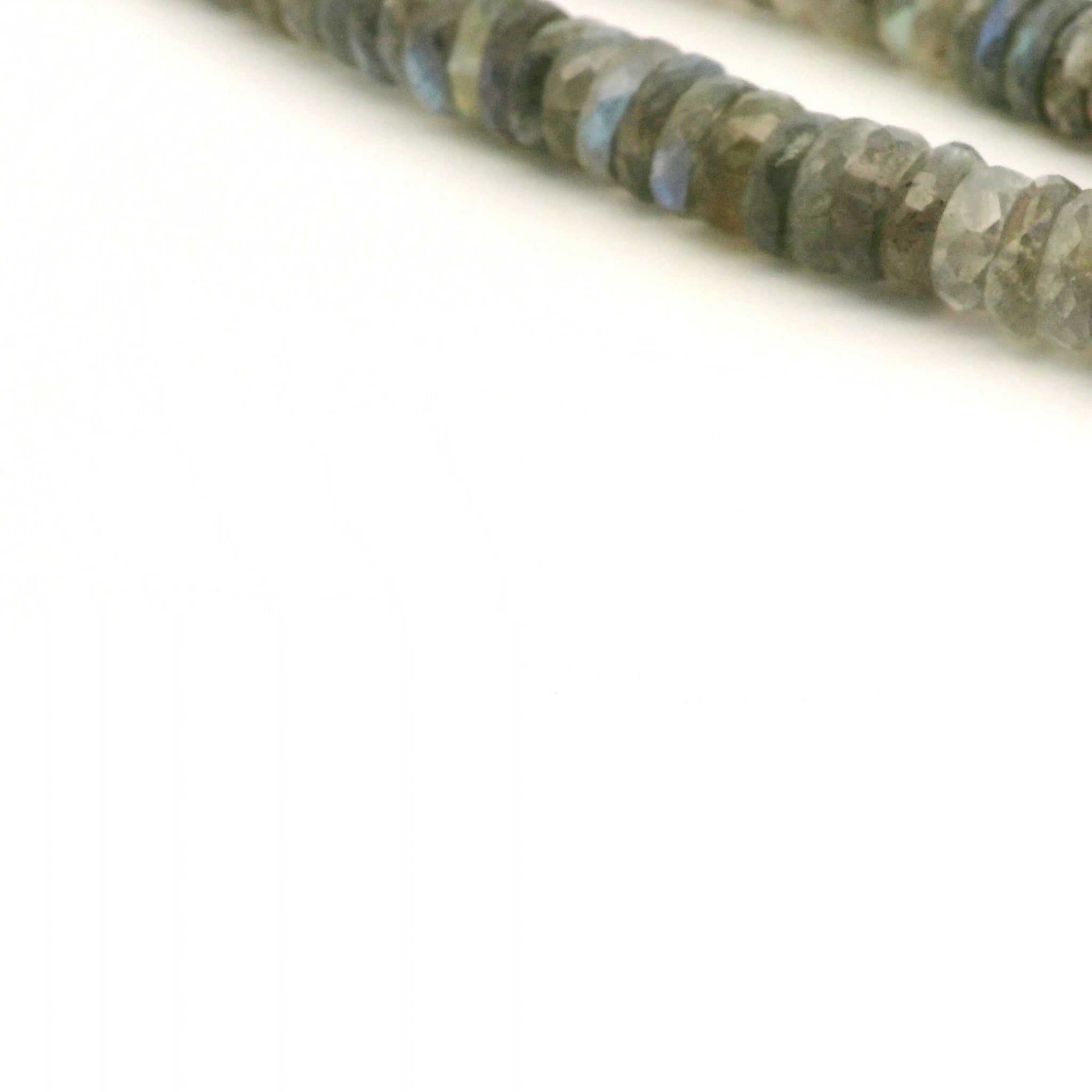 This strand features natural labradorite faceted rondelle beads in soft gray tones with beautiful flashes of blue and green labradorescence. The beads are finely faceted to enhance their natural shimmer and polished for a smooth, elegant finish. Ideal for creating necklaces, bracelets, earrings, and other custom jewelry designs. Each bead is unique, showing natural variations in color, flash, and internal inclusions that highlight the organic beauty of genuine labradorite.