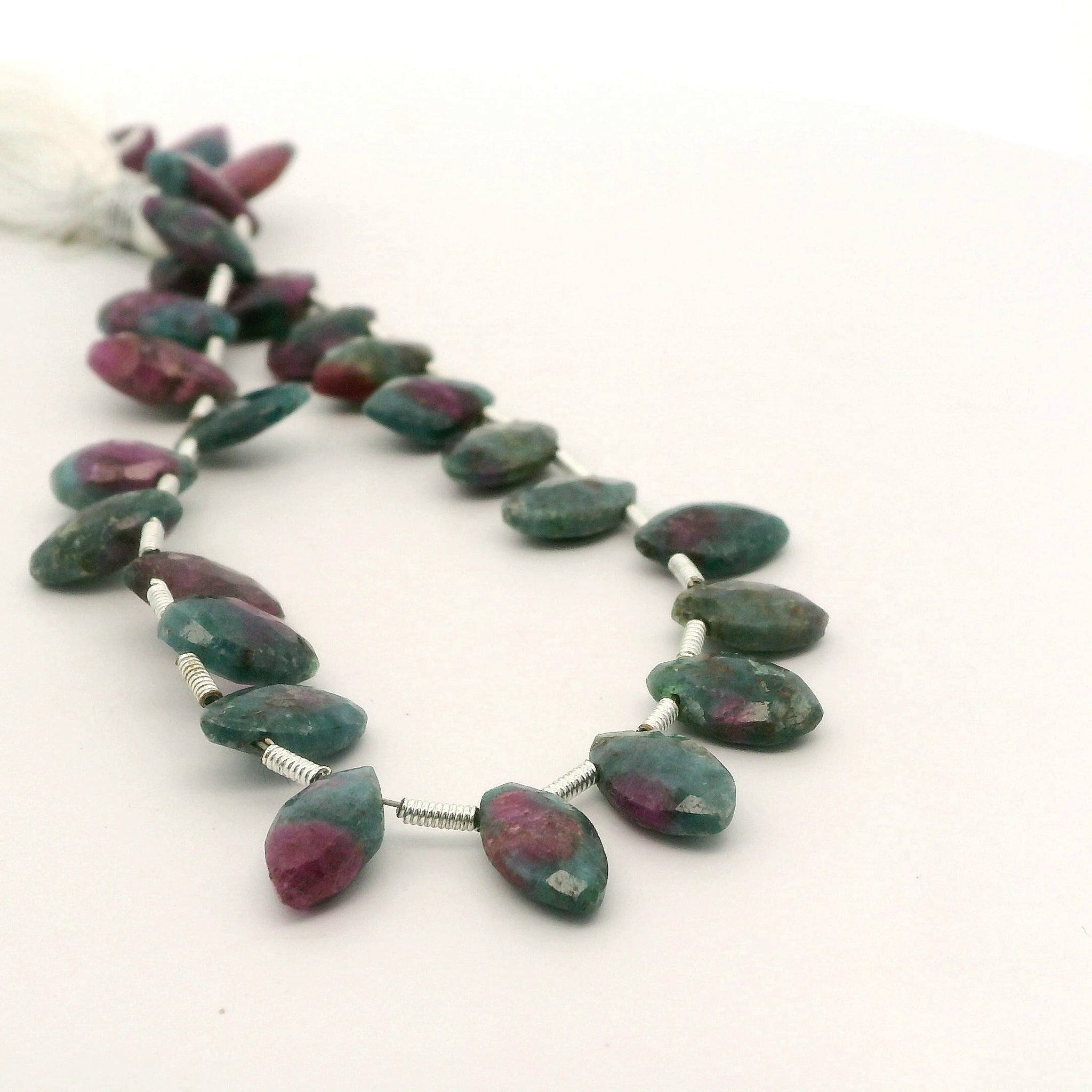 Beautiful Natural Ruby Zoisite Faceted Pear Briolette Beads featuring a striking mix of deep ruby tones blended with rich green zoisite. Each bead is faceted to enhance sparkle and color contrast. These strands include 27 beads, perfectly arranged for high-end jewelry designs such as earrings, necklaces, and wire-wrapped pieces.