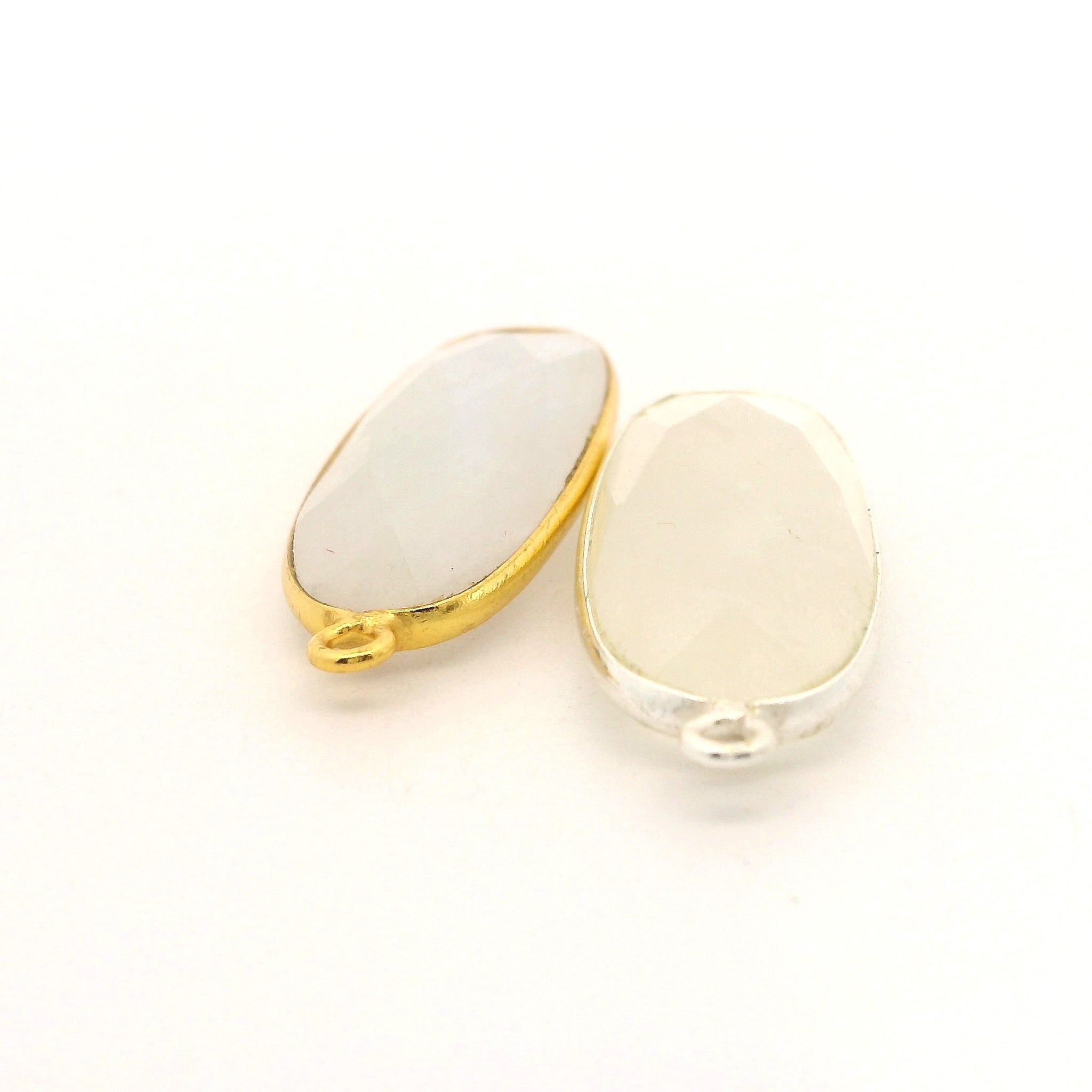 Add a vibrant pop of color to your jewelry creations with this Rainbow Moonstone Oval Shape Bezel Pendant. The striking Moonstone gemstone is beautifully cut in a Oval shape and set in a sleek bezel frame, available in both Gold Plated Over Sterling Silver and Sterling Silver finishes. The one-loop design makes it easy to attach to chains, earrings, or bracelets — perfect for elegant and modern jewelry designs.