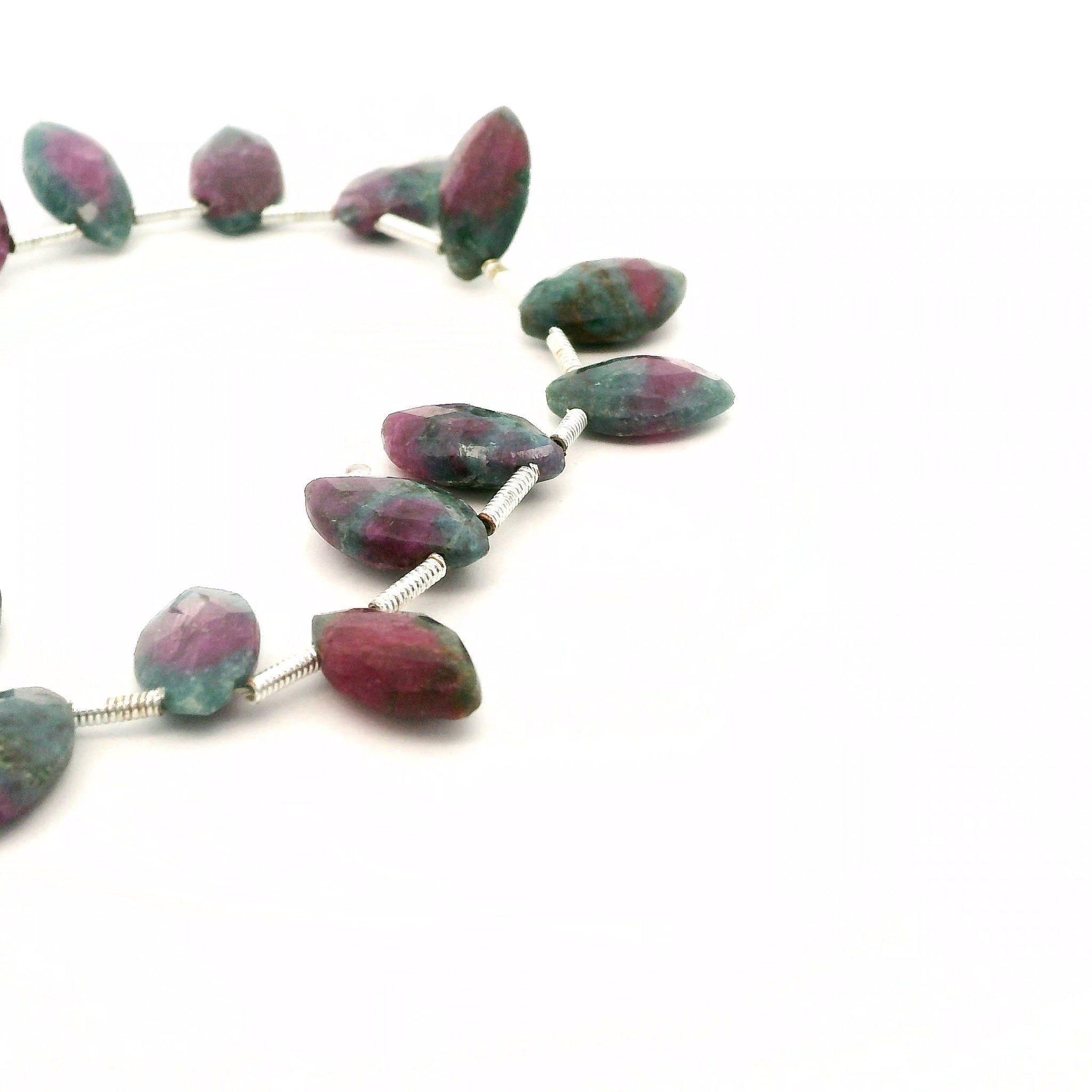 These natural ruby zoisite faceted marquise beads showcase a striking mix of deep green zoisite with vivid pink to reddish ruby inclusions. The elegant marquise (leaf-shaped) cut combined with fine faceting adds texture and sparkle, making these beads ideal for necklaces, bracelets, earrings, and focal jewelry designs. Beads are center-drilled and shown temporarily strung for protection and display. Natural variations in color distribution, clarity, and shape are expected and enhance the unique character of genuine ruby zoisite.