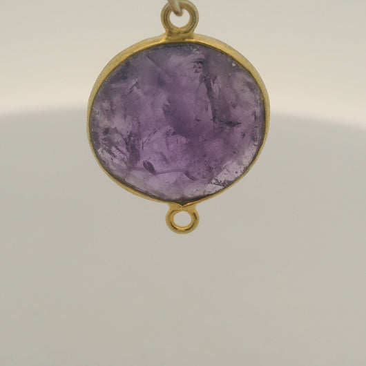 This natural amethyst connector features a round shape bezel in real gold plated 925 sterling silver.