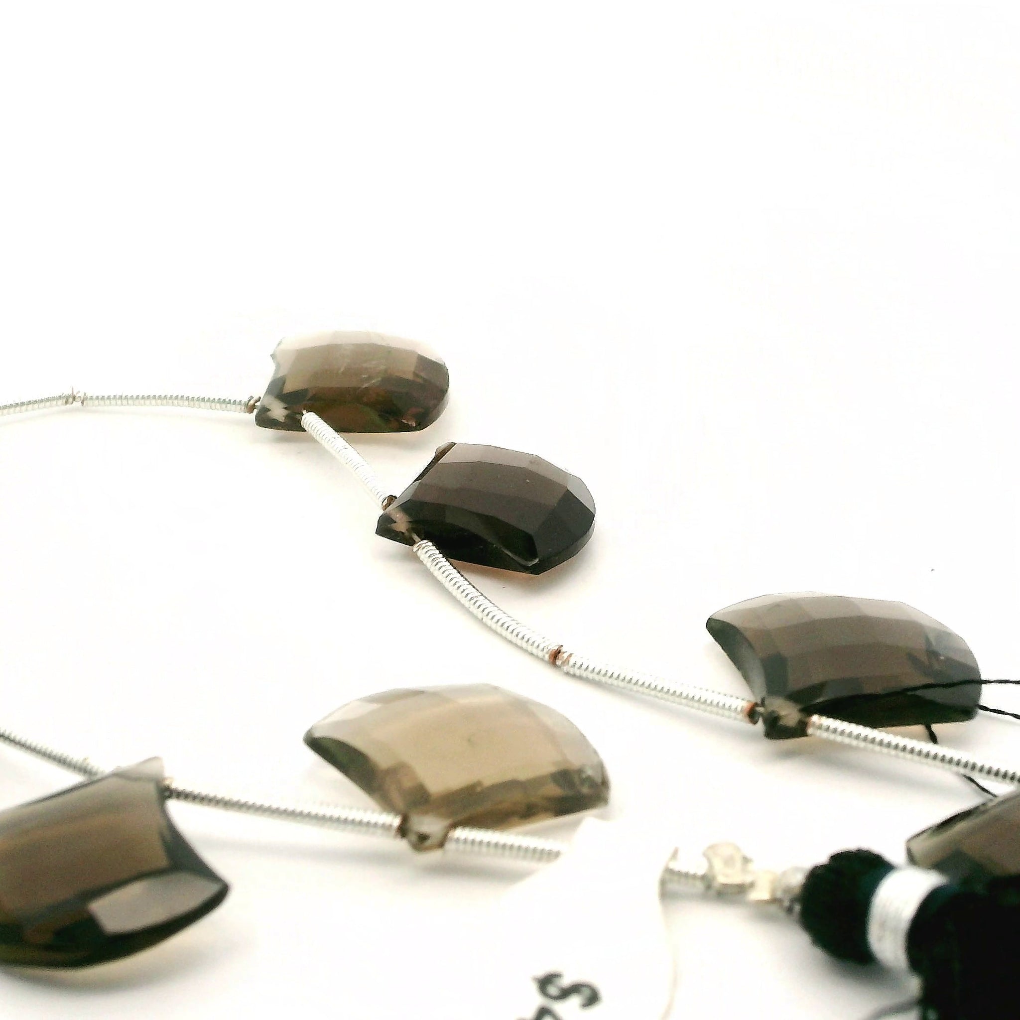 These natural smoky quartz faceted fan beads feature rich brown to deep smoky tones with crisp faceting that creates elegant light reflection. The unique fan (half-moon) shape adds movement and a modern, organic look, making these beads ideal for statement necklaces, pendants, earrings, and focal jewelry designs. Beads are center-drilled and shown temporarily strung for display. Natural variations in color, clarity, and shape are expected and highlight the genuine character of smoky quartz.