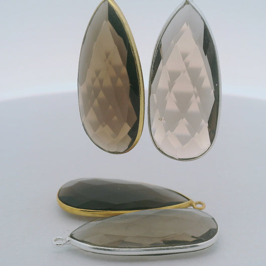 This faceted smoky quartz pear connector features a bezel setting in real gold plated 925 sterling silver with one loop.